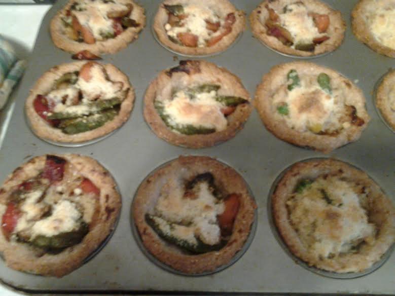 Then I take Broccoli, carrots, sugar snap peas, red preppers, water chestnuts and stir fry the veggies till tender, adding 2 TB Braggs liq. Aminos, 1 tsp ginger powder, 1 tsp curry powder, mixing and stirring until the veggies are not limp but tender, Then I fill the biscuit tarts with veggies, top with garlic parmesan ( 1/2 cup parmesan with 3 TB garlic powder or salt your choice) and bake at 450 for the 10-12 mins.
